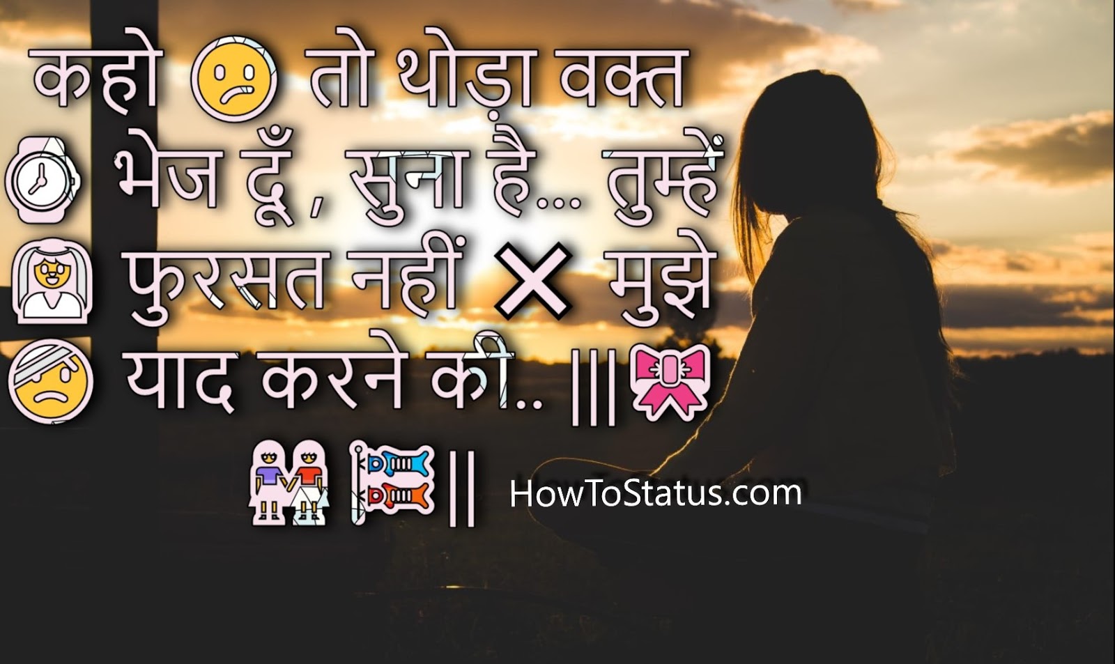कहो 😕 तो थोड़ा वक्त ⌚ भेज दूँ , सुना है… तुम्हें 👰 फुरसत नहीं ❌ मुझे 🤕 याद करने की.. |||🎀👭🎏||| #HowToStatus